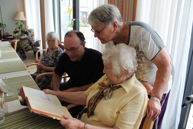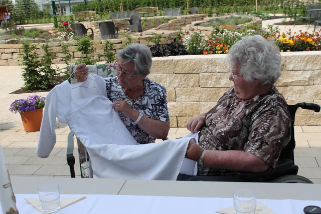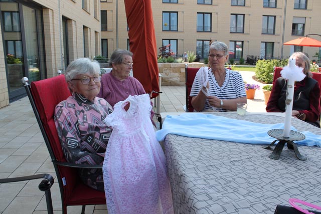 Birgit Wapelhorst hat jeweils verschiedene Dinge dazu mitgebracht. Die Senioren waren sehr von dem Tauf- und Kommunionkleid angetan. „So eine schöne Spitze an dem Taufkleid!“, sagt Frau Hesse. „Der Stoff fühlt sich wunderbar weich an und die schönen aufgenähten Perlen…“ bemerkt Frau Degener ganz verträumt zu dem Kommunionkleid. Bestimmt denkt sie dabei an ihr eigenes Kommunionkleid.
