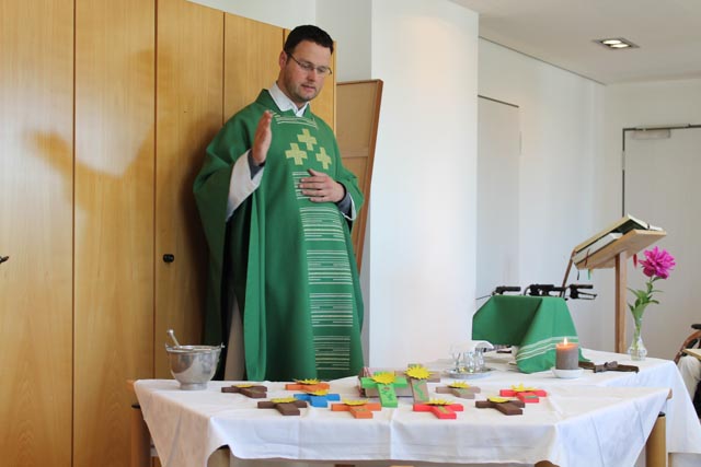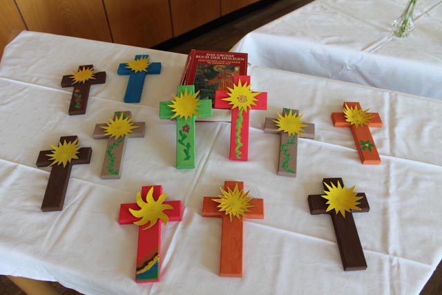 Am nächsten Tag wurde darüber gesprochen, wo uns in unserem Leben überall Kreuze begegnen. Nachmittags wurden dann von jedem Bewohner selber Holzkreuze bemalt und am nächsten Tag im Gottesdienst von Pastor Zwingmann gesegnet. Den Gottesdienst haben die WGler aktiv mitgestaltet. Sie haben Fürbitten vorgetragen und kräftig „Fest soll mein Taufbund immer stehen….“ mitgesungen.