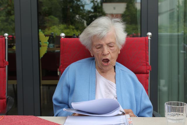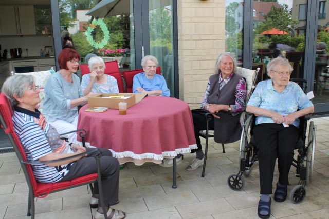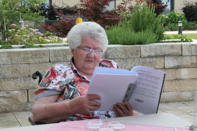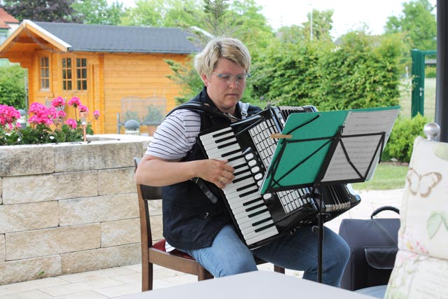 und viele weitere Volkslieder wurden bei einem musikalischen Nachmittag gesungen. Begleitet haben uns Martina Heppe mit ihrem Akkordeon und Helga Gröne mit ihrer schönen Stimme. Das Wetter war herrlich. Also haben wir kurzerhand beschlossen, draußen auf der Terrasse zu musizieren. So hatten die Bewohner vom Haus Maria und Gäste der Tagespflege auch etwas davon.