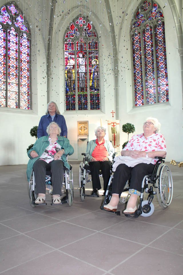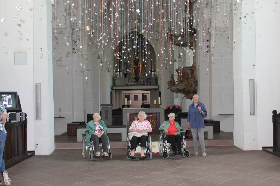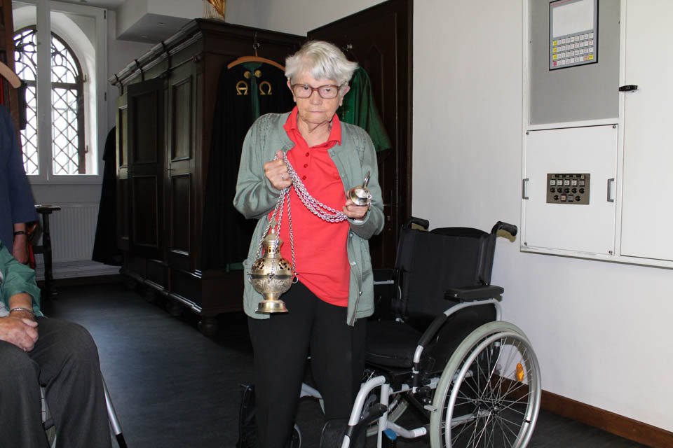 Unsere Praktikantin Sarah Heilkenbrinker ist anschließend noch mit uns in die Sakristei gegangen und hat uns ein altes grünes Messgewand aus Samt, den Kelch und die Hostienschale der Stadtkirche sowie das neue Weihrauchfass gezeigt. Sehr interessiert lauschten die Seniorinnen den Ausführungen unserer Praktikantin. Auch eine Kerze für die Lieben wurde angezündet.